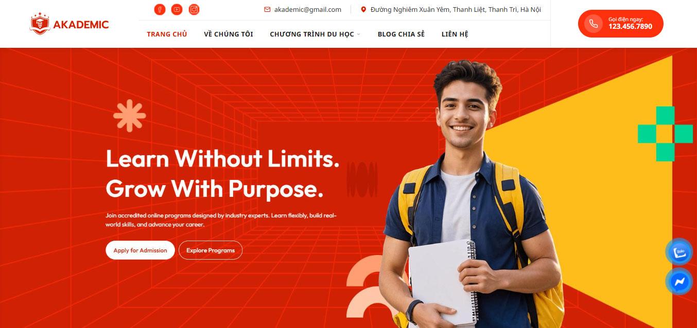 Cuối trang là form "Đăng ký tư vấn miễn phí" với các ô nhập liệu rõ ràng trên nền hình ảnh học đường, giúp tăng tỷ lệ chuyển đổi và hỗ trợ khách hàng nhanh chóng. Footer được sắp xếp khoa học với đầy đủ thông tin liên hệ, danh sách đối tác giáo dục và các liên kết chính sách, đảm bảo tính chuyên nghiệp và dễ dàng điều hướng.