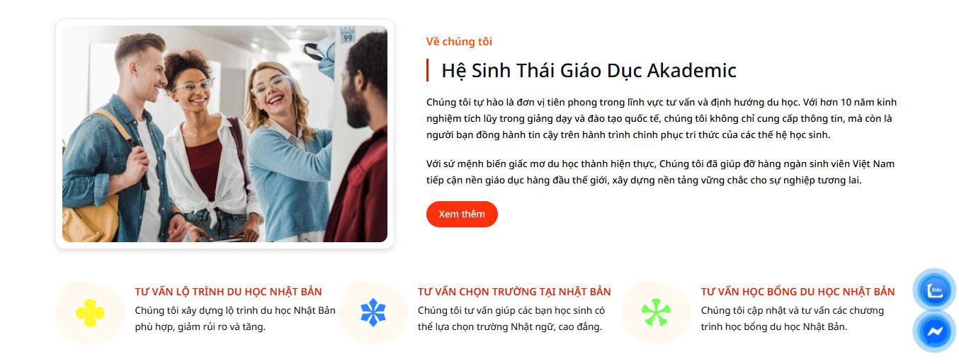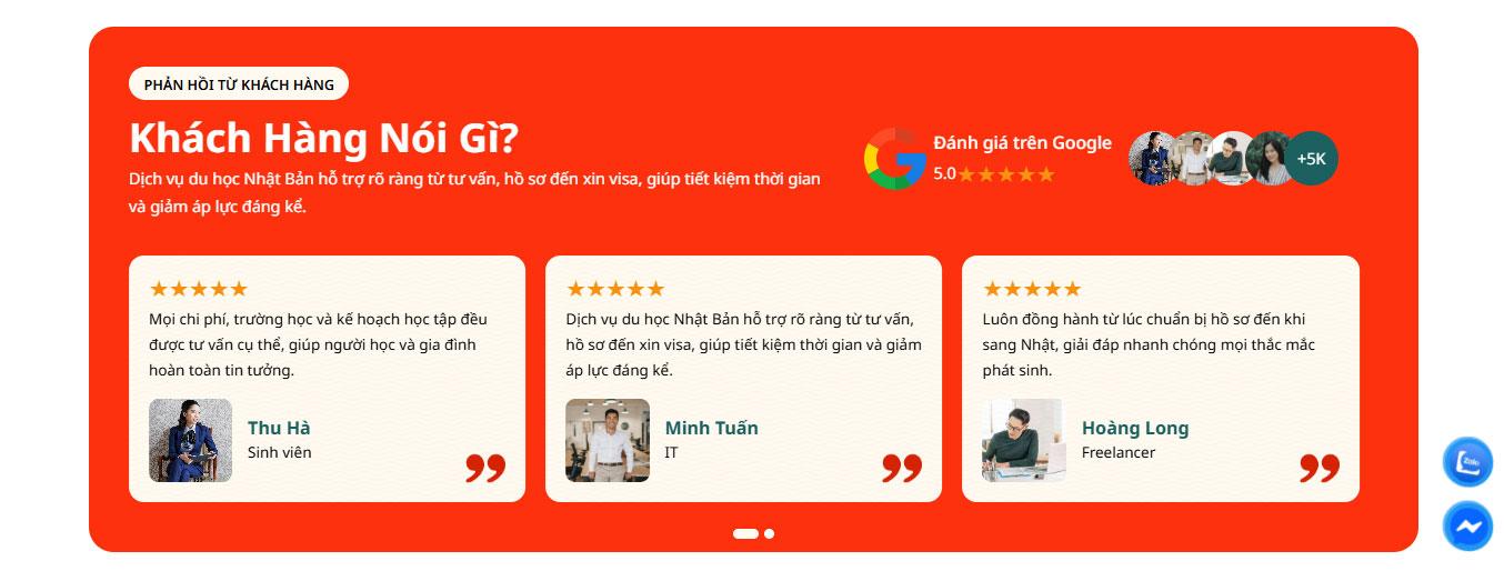 Khối giới thiệu được thiết kế trực quan, kết hợp giữa hình ảnh môi trường giáo dục quốc tế và các con số ấn tượng (5000+ học viên, 98% hài lòng, 12 năm kinh nghiệm), đi kèm các biểu tượng minh họa cho cam kết về chất lượng tư vấn, lộ trình rõ ràng và hỗ trợ tận tâm, giúp củng cố niềm tin tuyệt đối từ khách hàng.