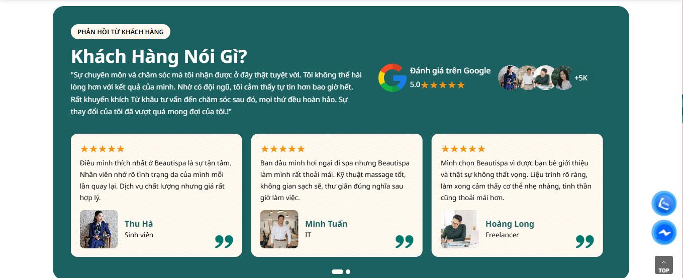 Bên cạnh đó, website tích hợp khu vực đánh giá khách hàng, hiển thị phản hồi thực tế nhằm tăng uy tín thương hiệu. Đồng thời, phần đội ngũ chuyên viên giúp khách hàng hiểu rõ hơn về tay nghề và kinh nghiệm của nhân sự.