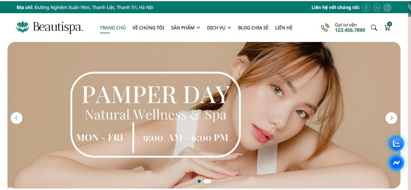 Ngay bên dưới là banner chính (slider) nổi bật với các chương trình khuyến mãi và dịch vụ chăm sóc da, giúp thu hút sự chú ý và tăng khả năng chuyển đổi khách hàng.