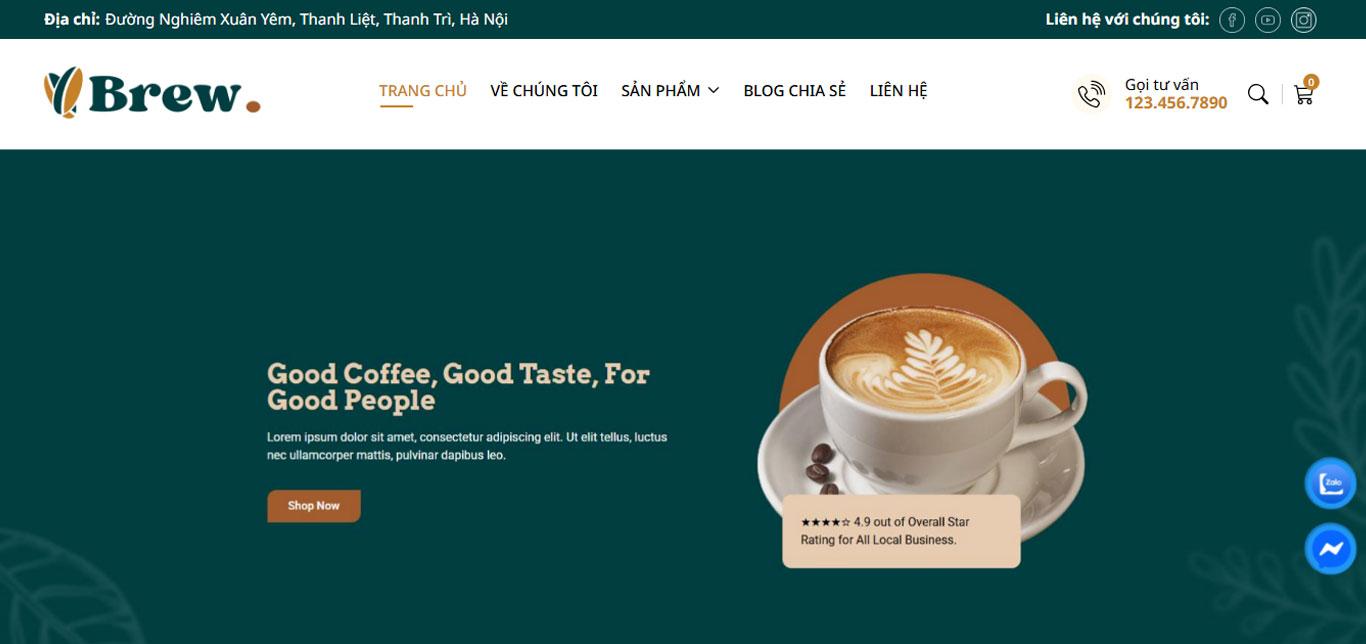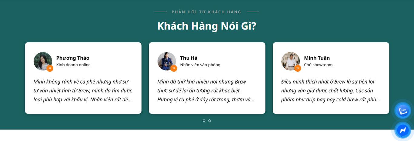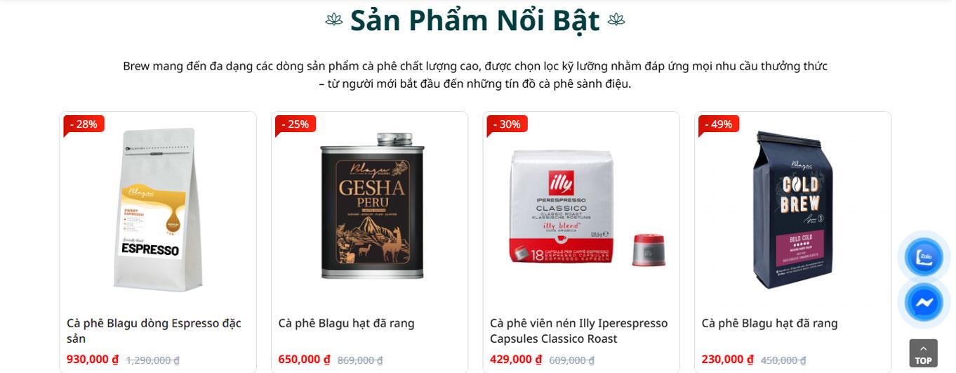 Section “Chào mừng bạn đến với Brew” kết hợp hình ảnh và nội dung: Nhấn mạnh chất lượng sản phẩm. Nguồn gốc minh bạch. Đa dạng lựa chọn. Tạo sự tin tưởng và kết nối cảm xúc với khách hàng.