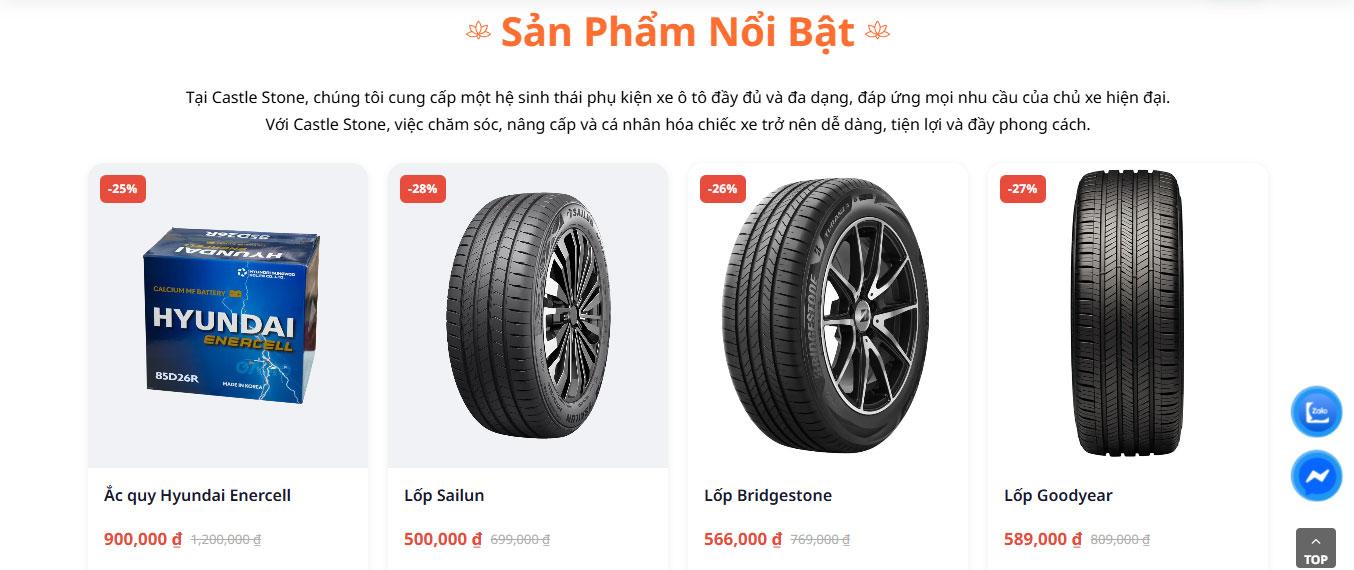 Website tích hợp khu vực Câu hỏi thường gặp (FAQ) tiện lợi bên cạnh hình ảnh kỹ thuật viên chuyên nghiệp, giúp giải đáp nhanh các thắc mắc về chính sách bảo hành và hướng dẫn lắp đặt. Phần Blog "Mẹo chăm sóc xe Castle Stone" được thiết kế dạng thẻ (card) hiện đại, hỗ trợ người dùng cập nhật những xu hướng nâng cấp xe mới nhất.