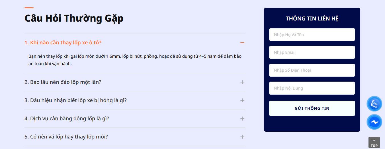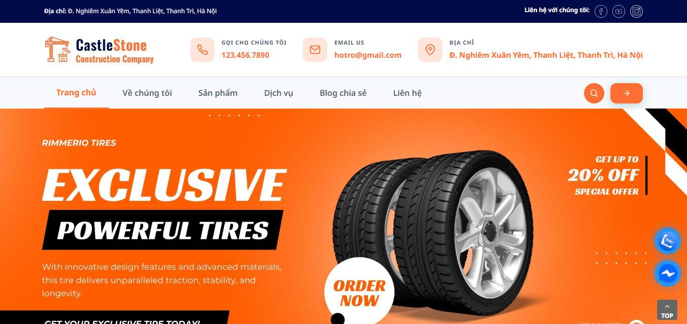 Website tích hợp khu vực Câu hỏi thường gặp (FAQ) tiện lợi bên cạnh hình ảnh kỹ thuật viên chuyên nghiệp, giúp giải đáp nhanh các thắc mắc về chính sách bảo hành và hướng dẫn lắp đặt. Phần Blog "Mẹo chăm sóc xe Castle Stone" được thiết kế dạng thẻ (card) hiện đại, hỗ trợ người dùng cập nhật những xu hướng nâng cấp xe mới nhất.