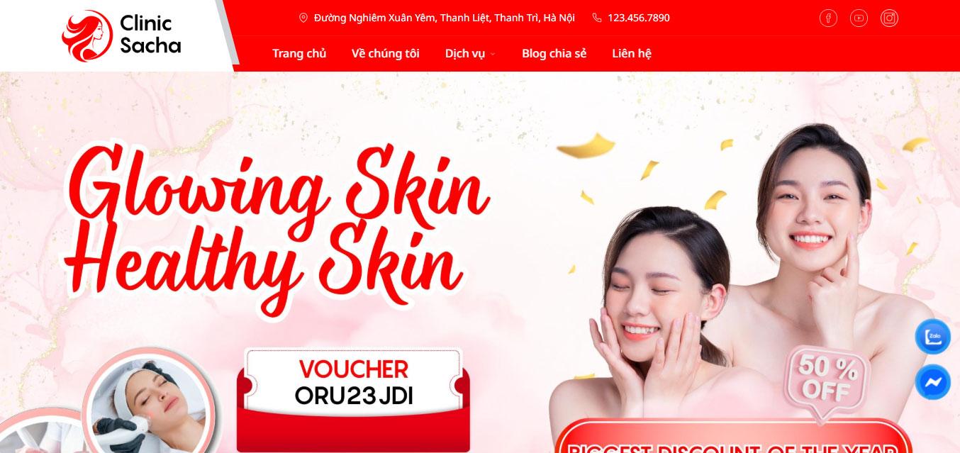 Giao diện website sử dụng tông màu đỏ kết hợp cùng nền trắng thanh lịch, tạo nên một không gian trực quan đậm chất "Wellness" và sự thư thái. Banner đầu trang nổi bật với hình ảnh người mẫu đang tận hưởng liệu trình spa cùng thông điệp "Beauty Clinic For You", khẳng định vị thế là điểm đến lý tưởng để tái tạo năng lượng ngay khi khách hàng truy cập.