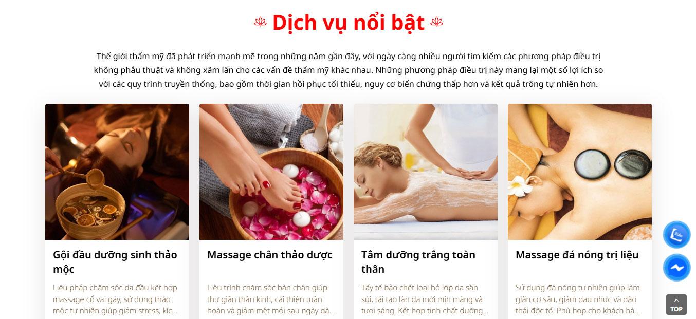 Phần dịch vụ nổi bật được trình bày dạng lưới (grid) 4 cột rõ ràng, hiển thị hình ảnh các liệu trình như chăm sóc da mặt, massage body, trị liệu chuyên sâu kèm theo mức giá minh bạch và nút "Đặt lịch ngay" màu nâu đồng bộ. Cách bố trí khoa học giúp người dùng dễ dàng lướt xem danh mục dịch vụ và lựa chọn giải pháp chăm sóc phù hợp.