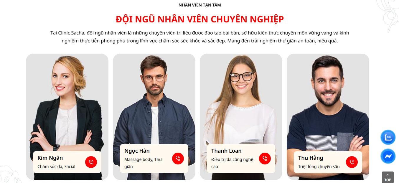 Website tích hợp khu vực Câu hỏi thường gặp (FAQ) tiện lợi bên cạnh hình ảnh chuyên viên tư vấn, giúp giải đáp nhanh các thắc mắc về quy trình và hiệu quả trị liệu. Phần Blog "Cẩm nang làm đẹp Sacha" được thiết kế dạng thẻ (card) hiện đại, hỗ trợ cập nhật những kiến thức chăm sóc da tại nhà và xu hướng thẩm mỹ mới nhất.