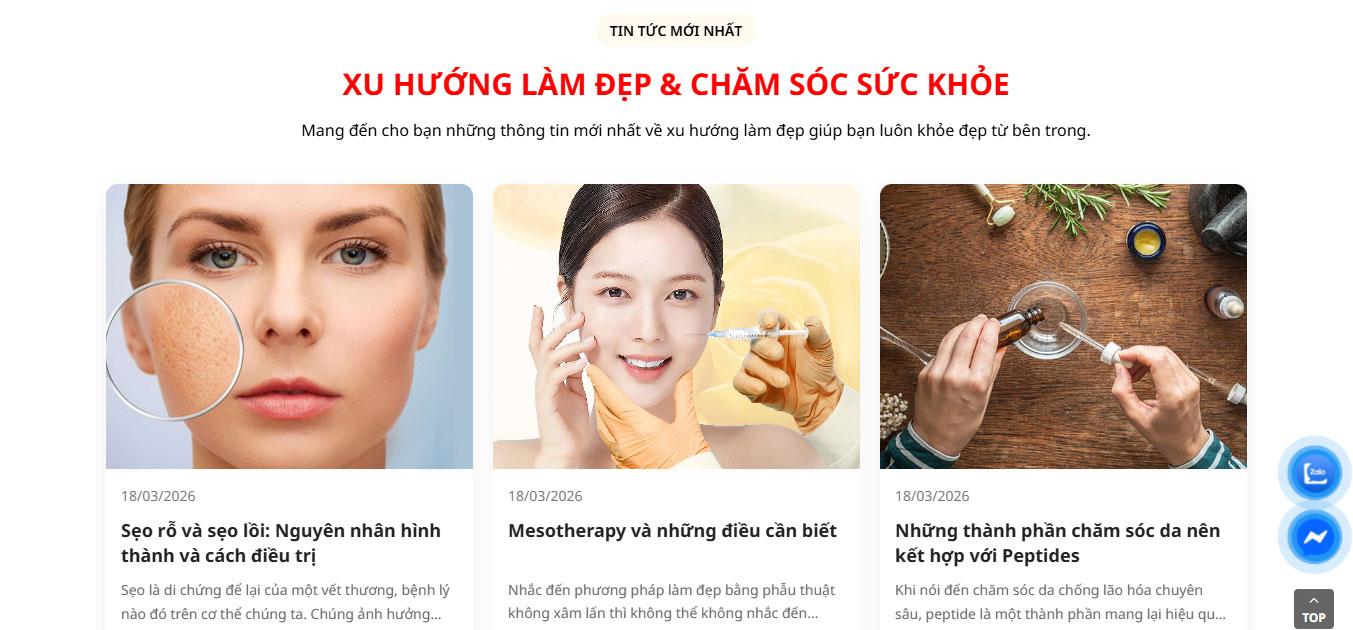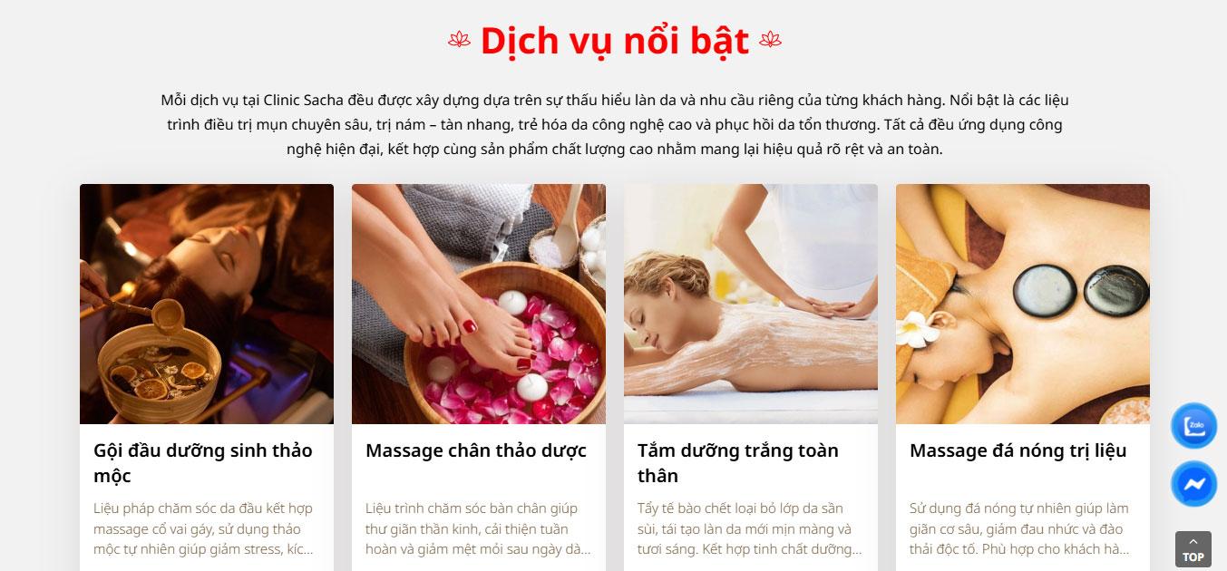 Website tích hợp khu vực Câu hỏi thường gặp (FAQ) tiện lợi bên cạnh hình ảnh chuyên viên tư vấn, giúp giải đáp nhanh các thắc mắc về quy trình và hiệu quả trị liệu. Phần Blog "Cẩm nang làm đẹp Sacha" được thiết kế dạng thẻ (card) hiện đại, hỗ trợ cập nhật những kiến thức chăm sóc da tại nhà và xu hướng thẩm mỹ mới nhất.