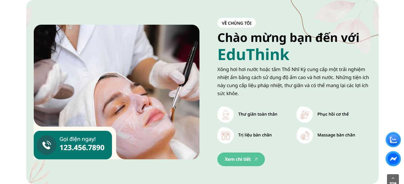 Phần dịch vụ nổi bật được trình bày dạng lưới (grid) 4 cột rõ ràng, hiển thị hình ảnh các liệu trình như chăm sóc da mặt, massage body, trị liệu chuyên sâu kèm theo mức giá minh bạch và nút "Đặt lịch ngay" màu nâu đồng bộ. Cách bố trí khoa học giúp người dùng dễ dàng lướt xem danh mục dịch vụ và lựa chọn giải pháp chăm sóc phù hợp.