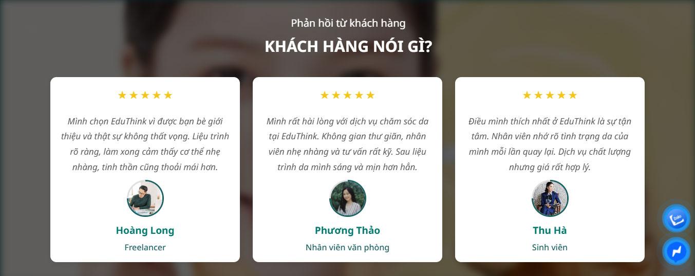 Khu vực giá trị cốt lõi "Vẻ đẹp & Sự tận tâm" được thể hiện qua bố cục khung hình oval nghệ thuật và các dòng liệt kê ưu điểm về phương pháp trị liệu an toàn và dược mỹ phẩm cao cấp. Tiếp sau đó là khối phản hồi khách hàng (Testimonials) trên nền màu nâu đậm, tạo điểm nhấn mạnh mẽ và gia tăng độ uy tín thông qua những đánh giá thực tế từ người trải nghiệm.