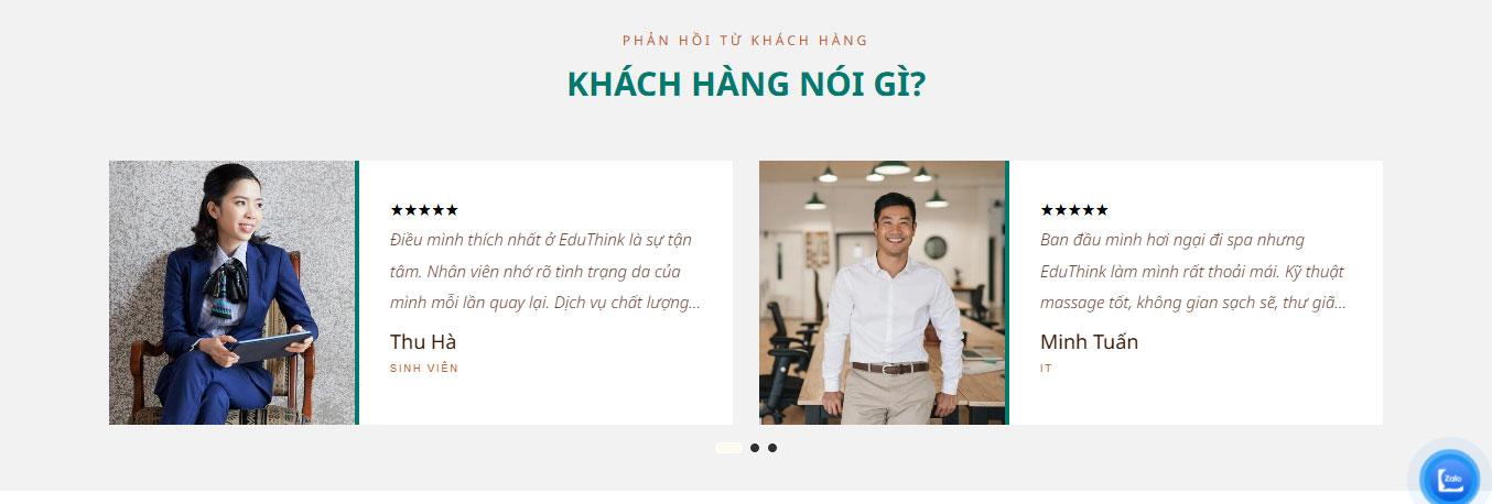 Khu vực giá trị cốt lõi "Vẻ đẹp & Sự tận tâm" được thể hiện qua bố cục khung hình oval nghệ thuật và các dòng liệt kê ưu điểm về phương pháp trị liệu an toàn và dược mỹ phẩm cao cấp. Tiếp sau đó là khối phản hồi khách hàng (Testimonials) trên nền màu nâu đậm, tạo điểm nhấn mạnh mẽ và gia tăng độ uy tín thông qua những đánh giá thực tế từ người trải nghiệm.