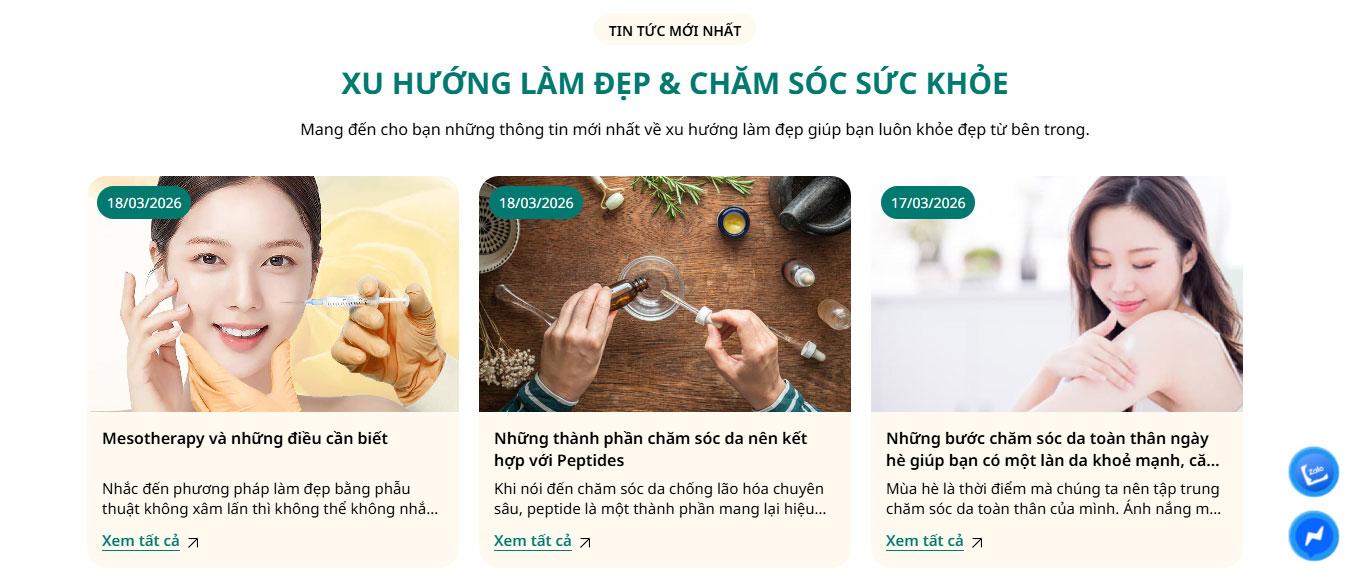 Cuối trang là form "Đăng ký tư vấn liệu trình" với các ô nhập liệu rõ ràng trên nền màu nhã nhặn, giúp tăng tỷ lệ tương tác và hỗ trợ khách hàng kịp thời. Footer được sắp xếp khoa học với đầy đủ thông tin liên hệ, logo các đối tác uy tín và liên kết chính sách, đảm bảo tính thẩm mỹ và dễ dàng điều hướng cho người dùng.