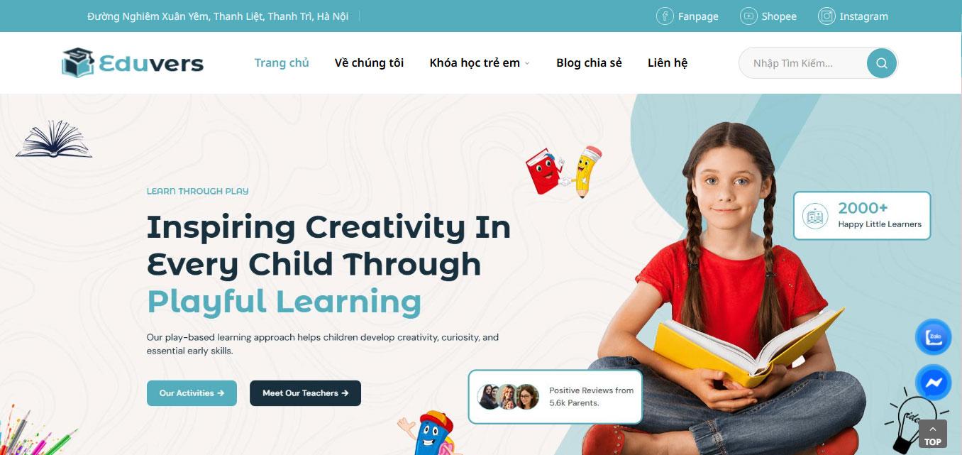Trang chủ khởi đầu với khu vực header tinh tế gồm logo thương hiệu Eduvers, hệ thống menu điều hướng khoa học và công cụ tìm kiếm khóa học tiện lợi. Ngay bên dưới là banner chính (Hero Section) đầy thu hút với slogan "Inspiring Creativity In Every Child Through Playful Learning", đi kèm hình ảnh bé gái đang say mê đọc sách, khẳng định triết lý lấy trẻ làm trung tâm của học viện.