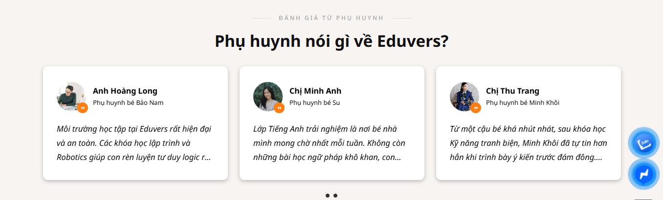 Website tích hợp khu vực Giải đáp thắc mắc (FAQ) với thiết kế thông minh, giúp phụ huynh nhanh chóng tìm hiểu về chương trình học và học phí. Bên cạnh đó, phần Đội ngũ giáo viên giới thiệu những người truyền cảm hứng có trình độ chuyên môn cao, tạo sự an tâm về chất lượng giảng dạy. Khu vực Phụ huynh nói gì về Eduvers? (Testimonials) mang đến những phản hồi chân thực nhất, tăng tính thuyết phục cho thương hiệu.
