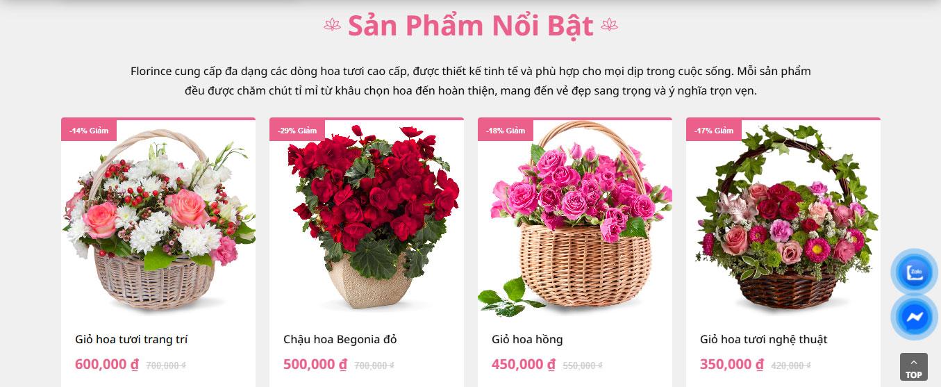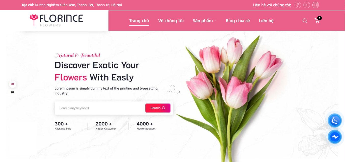 Giao diện website sử dụng tông màu hồng pastel kết hợp trắng và be, tạo cảm giác mềm mại và thu hút thị giác. Banner đầu trang nổi bật với hình ảnh hoa tươi sắc nét cùng thông điệp rõ ràng, giúp gây ấn tượng mạnh ngay từ lần truy cập đầu tiên.