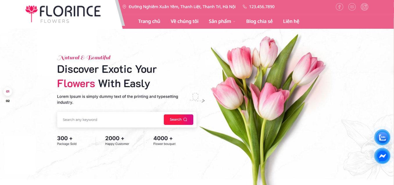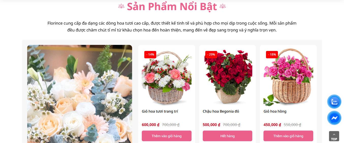 Giao diện website được thiết kế theo phong cách nhẹ nhàng, tinh tế với tông màu hồng chủ đạo, phù hợp cho lĩnh vực hoa tươi và quà tặng. Giao diện mang lại cảm giác sang trọng, lãng mạn, giúp khách hàng dễ dàng khám phá sản phẩm và trải nghiệm mua sắm trực tuyến một cách thuận tiện.