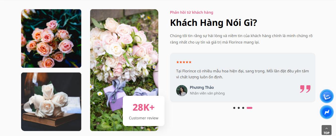Phần đánh giá khách hàng sử dụng nền màu tối để tạo điểm nhấn, kết hợp nội dung phản hồi thực tế giúp tăng độ tin cậy. Khu vực blog – tin tức được thiết kế dạng card hiện đại, hỗ trợ người dùng cập nhật xu hướng và ý tưởng về hoa tươi.