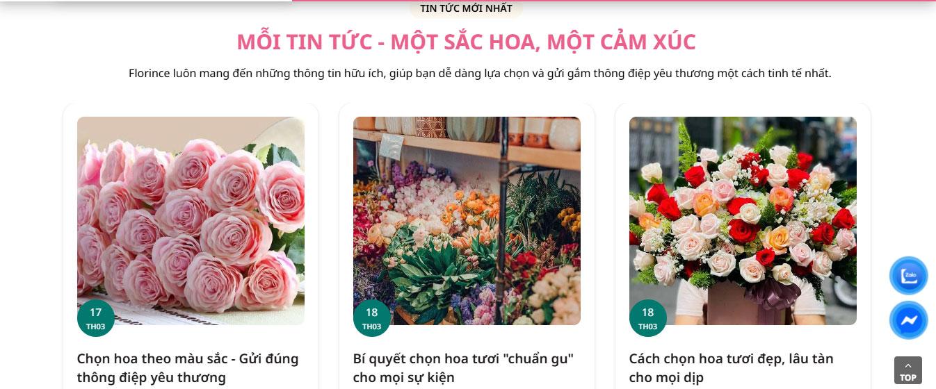 Phần đánh giá khách hàng sử dụng nền màu tối để tạo điểm nhấn, kết hợp nội dung phản hồi thực tế giúp tăng độ tin cậy. Khu vực blog – tin tức được thiết kế dạng card hiện đại, hỗ trợ người dùng cập nhật xu hướng và ý tưởng về hoa tươi.
