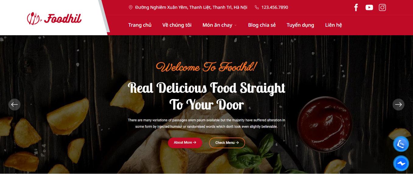 Giao diện website sử dụng tông màu đỏ đặc trưng của ngành thực phẩm kết hợp cùng nền trắng thanh lịch, tạo nên sự hài hòa và kích thích vị giác. Banner đầu trang nổi bật với hình ảnh món ăn đặc sắc cùng thông điệp "Delicious Food For You", gây ấn tượng mạnh về chất lượng ẩm thực ngay từ khi khách hàng truy cập.
