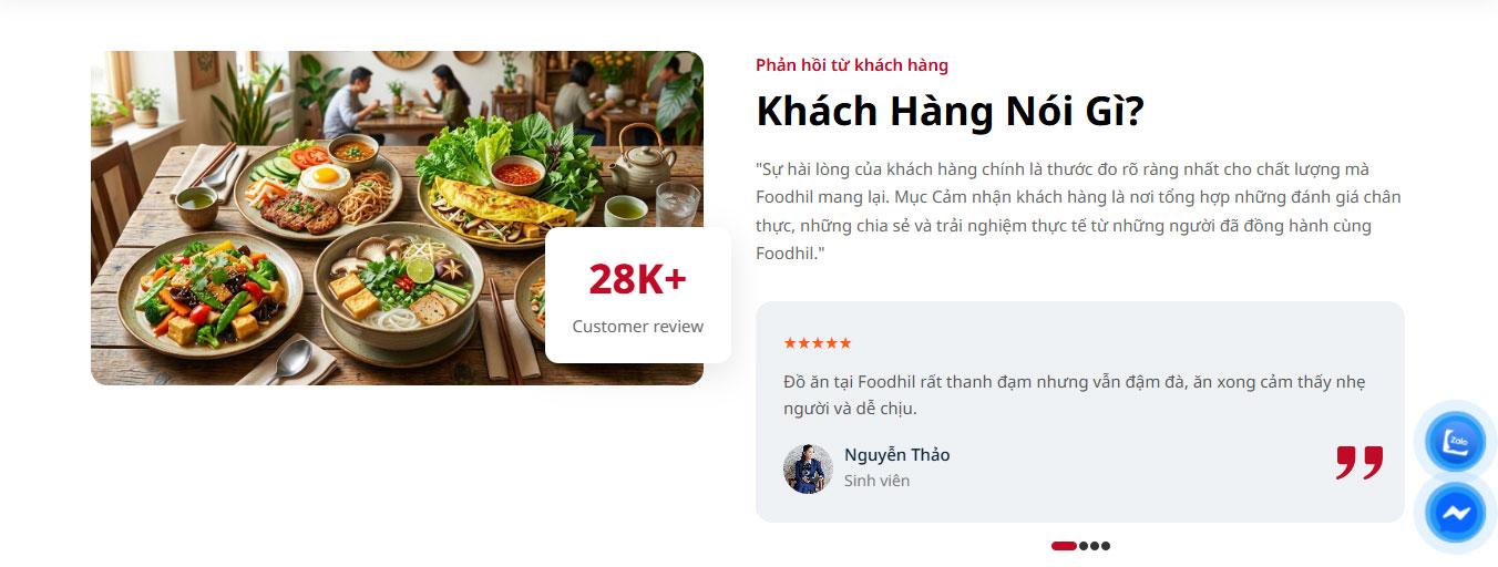 Khu vực giá trị dịch vụ "Ngon miệng & Tươi mới" được thể hiện qua bố cục khung hình oval nghệ thuật và các dòng mô tả ngắn gọn về quy trình tuyển chọn nguyên liệu. Tiếp sau đó là khối phản hồi khách hàng (Testimonials) trên nền cam đậm làm điểm nhấn, giúp tăng tính khách quan và uy tín cho thương hiệu thông qua những trải nghiệm thực tế.