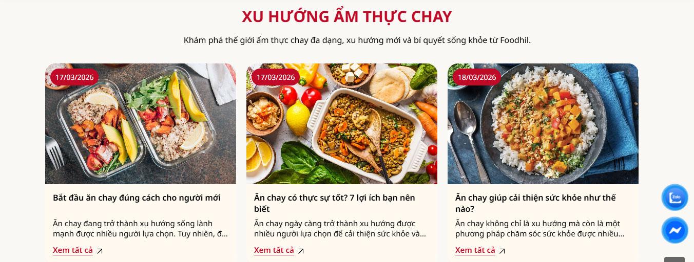 Website tích hợp khu vực Câu hỏi thường gặp (FAQ) tiện lợi cùng khối giới thiệu đội ngũ đầu bếp chuyên nghiệp, tạo cảm giác thân thiện và tin cậy. Phần Blog "Góc ẩm thực Foodhil" được thiết kế dạng thẻ (card) hiện đại, là nơi chia sẻ các bí quyết nấu ăn và xu hướng ẩm thực mới nhất.