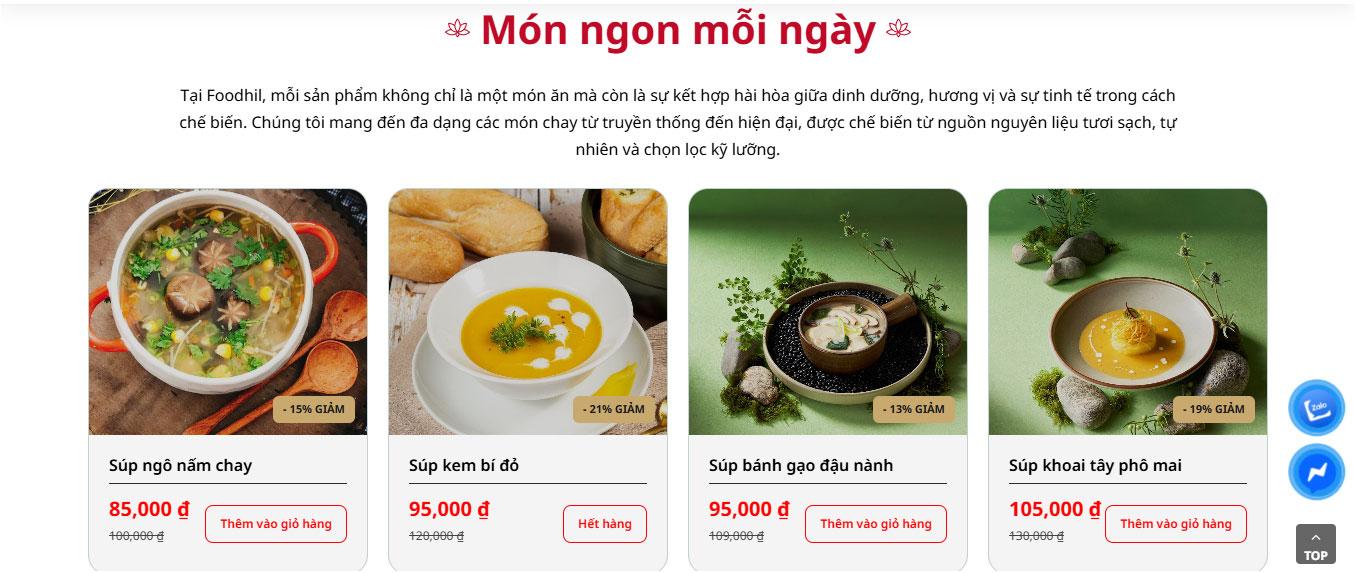 Phần sản phẩm nổi bật được trình bày dạng lưới (grid) 4 cột rõ ràng, hiển thị hình ảnh món ăn sắc nét, tên gọi, giá bán và nút "Thêm vào giỏ hàng" nổi bật. Cách bố trí này giúp thực khách dễ dàng lướt xem danh mục và lựa chọn món ăn yêu thích chỉ với vài thao tác đơn giản.