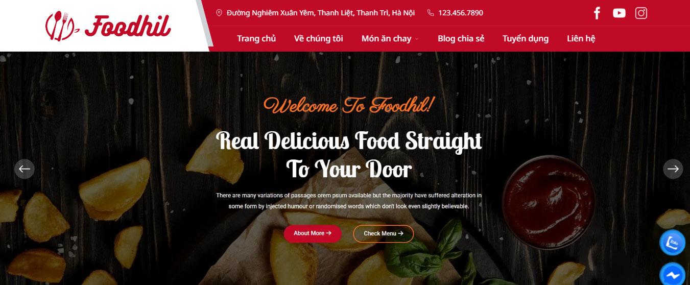 Nhìn chung, giao diện website Foodhil được thiết kế trực quan, hiện đại và thân thiện với người dùng. Sự kết hợp giữa hình ảnh món ăn hấp dẫn, bố cục rõ ràng và nội dung đầy đủ giúp trang web mang lại trải nghiệm đặt món trực tuyến thuận tiện, đồng thời truyền tải thông điệp về ẩm thực chay lành mạnh và tốt cho sức khỏe.