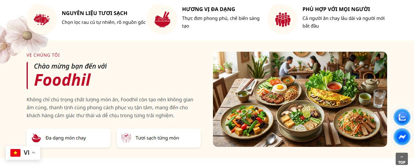 Tiếp theo là khu vực giới thiệu các giá trị nổi bật của thương hiệu với các biểu tượng minh họa như nguyên liệu tươi sạch, hương vị đa dạng và phù hợp với nhiều đối tượng khách hàng. Nội dung được trình bày ngắn gọn nhưng rõ ràng, giúp người dùng hiểu được những điểm mạnh của dịch vụ mà Foodhil mang lại. Phần giới thiệu về Foodhil được thiết kế kết hợp giữa hình ảnh các món ăn phong phú và nội dung mô tả về thương hiệu. Nội dung nhấn mạnh việc cung cấp các món ăn chay ngon, giàu dinh dưỡng và được chế biến từ nguyên liệu tươi sạch. Mục này giúp xây dựng hình ảnh chuyên nghiệp và tạo sự tin tưởng đối với khách hàng.