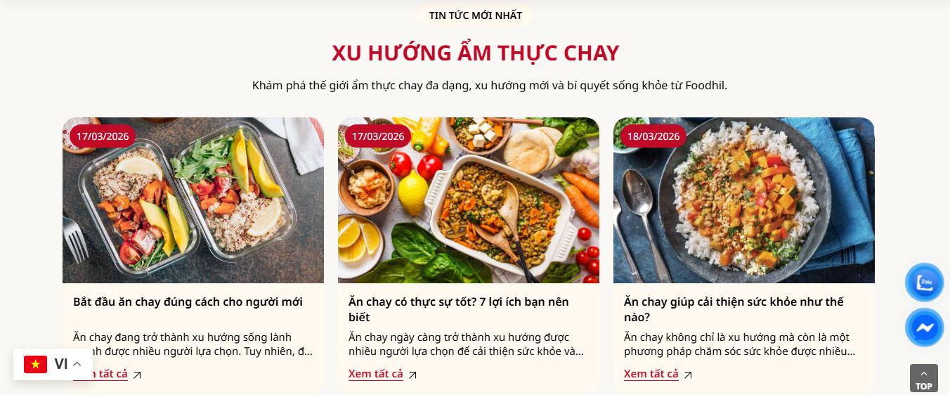 Ngoài ra, website còn có mục chia sẻ kiến thức với tiêu đề “Xu hướng ẩm thực chay”. Khu vực này cung cấp các bài viết liên quan đến chế độ ăn chay, cách chế biến món ăn và những xu hướng ẩm thực lành mạnh, giúp người dùng có thêm nhiều thông tin hữu ích.
