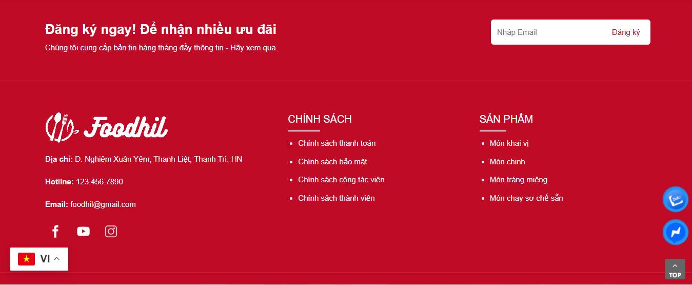 Cuối trang là phần chân trang chứa thông tin liên hệ của cửa hàng như địa chỉ, số điện thoại và email. Bên cạnh đó còn có các mục chính sách và danh mục sản phẩm để khách hàng dễ dàng tra cứu thông tin. Ngoài ra, người dùng cũng có thể đăng ký nhận email để cập nhật các chương trình ưu đãi và tin tức mới từ Foodhil.