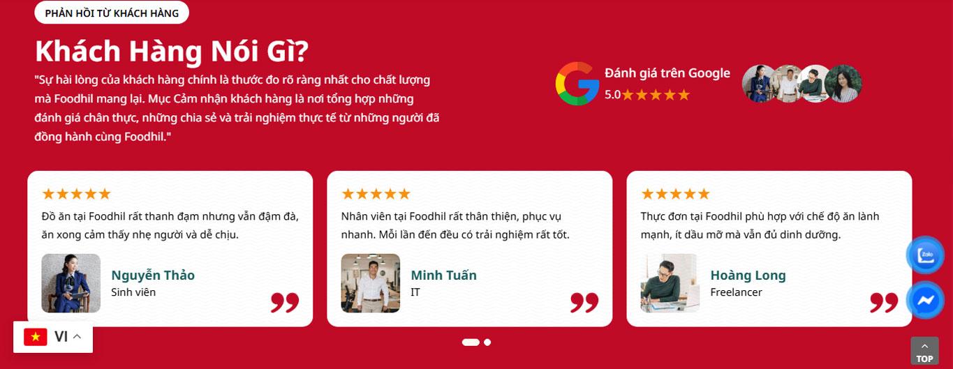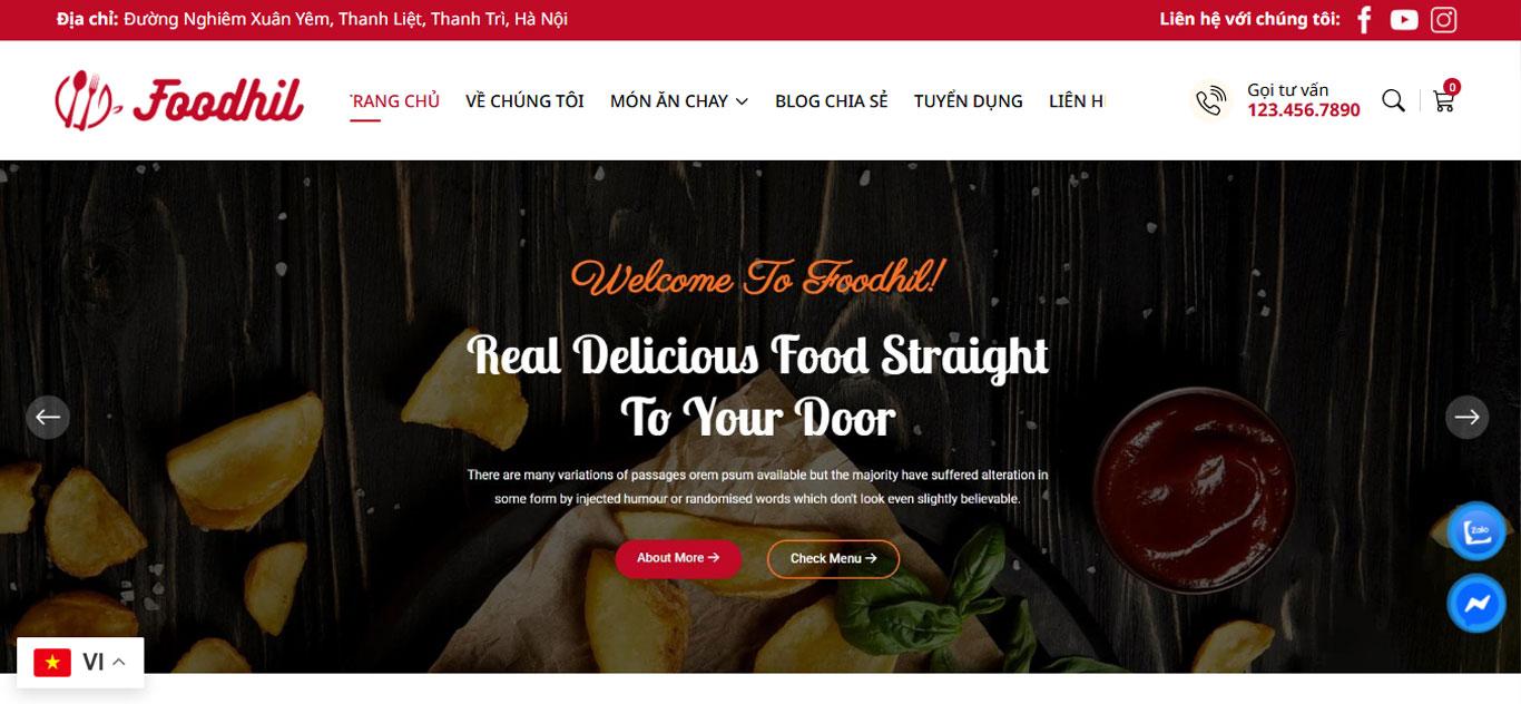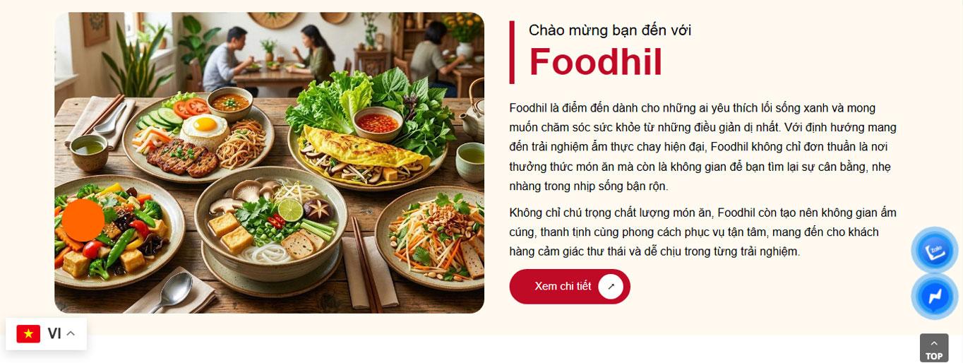 Nhìn chung, giao diện website Foodhil được thiết kế trực quan, hiện đại và thân thiện với người dùng. Sự kết hợp giữa hình ảnh món ăn hấp dẫn, bố cục rõ ràng và nội dung giới thiệu đầy đủ giúp trang web mang lại trải nghiệm đặt món trực tuyến thuận tiện, đồng thời truyền tải thông điệp về ẩm thực chay lành mạnh và tốt cho sức khỏe.