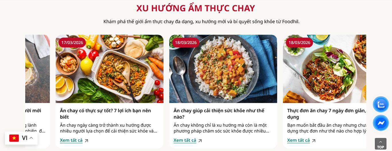 Ngoài ra, website còn có mục chia sẻ thông tin với tiêu đề “Xu hướng ẩm thực chay”. Tại đây người dùng có thể đọc các bài viết liên quan đến chế độ ăn chay, các món ăn mới và những xu hướng ẩm thực lành mạnh. Điều này giúp website không chỉ là nơi đặt món mà còn là nguồn thông tin hữu ích cho những người quan tâm đến lối sống ăn chay.