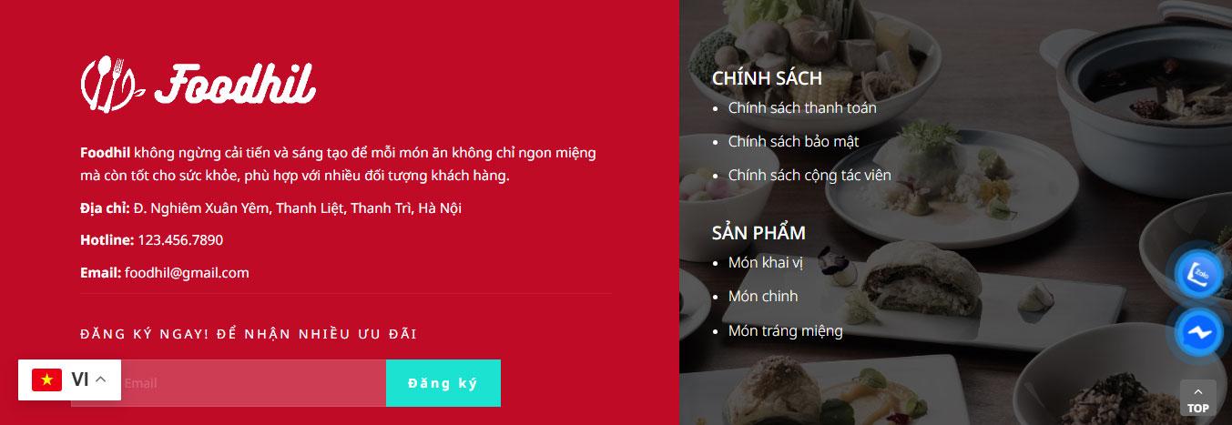 Cuối trang là phần chân trang chứa thông tin liên hệ của cửa hàng như địa chỉ, số điện thoại và email. Ngoài ra còn có các mục chính sách và danh mục sản phẩm giúp người dùng dễ dàng tìm kiếm thông tin cần thiết. Bên cạnh đó còn có khu vực đăng ký nhận email để khách hàng cập nhật các chương trình ưu đãi và thông tin mới từ Foodhil.