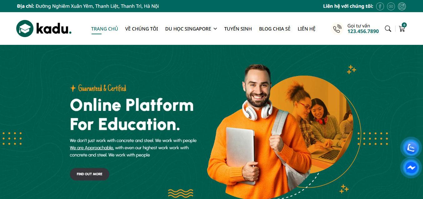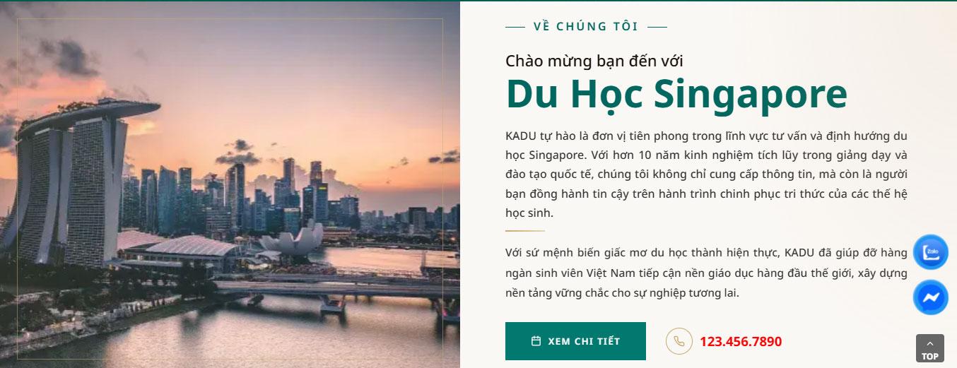 Giao diện website sử dụng tông màu xanh rực rỡ kết hợp cùng nền trắng thanh lịch, tạo nên sự nhiệt huyết và tinh thần dẫn đầu. Banner đầu trang nổi bật với hình ảnh học sinh năng động cùng thông điệp "Study In Singapore - Kadu Solutions For You", khẳng định vị thế là cầu nối giáo dục tin cậy ngay khi người dùng truy cập.