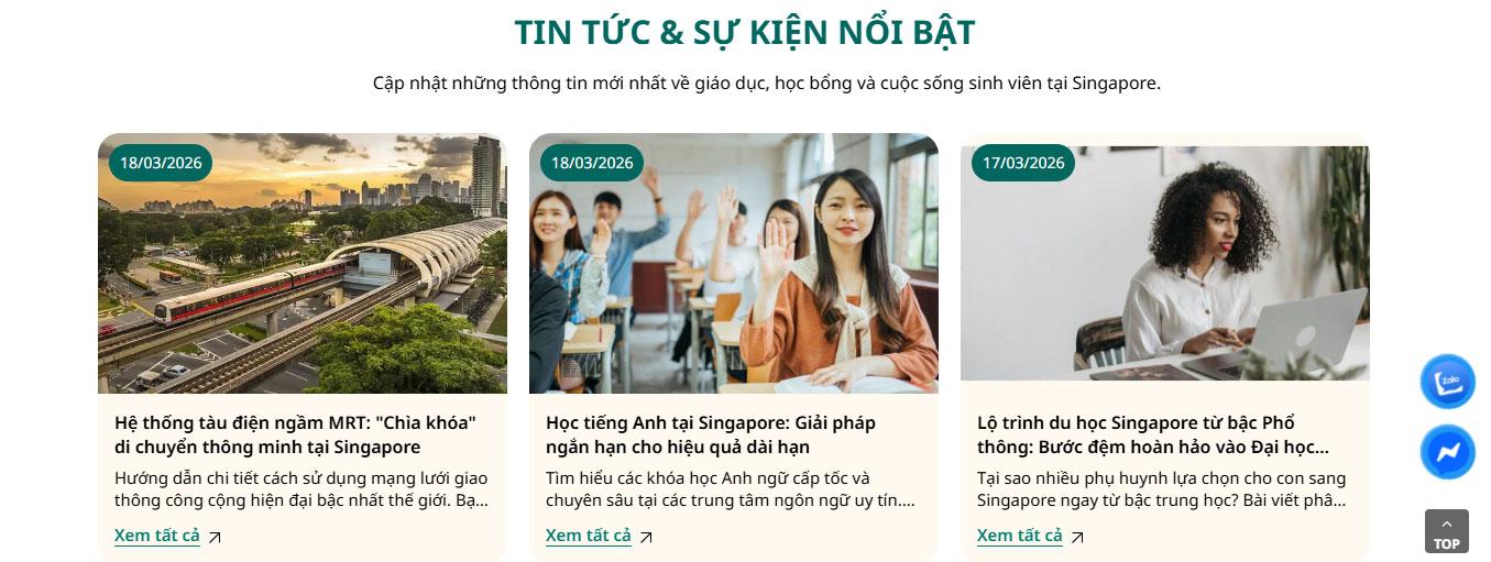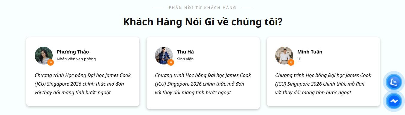 Khu vực giá trị cốt lõi "Kiến tạo tương lai" được thể hiện qua bố cục khung hình oval nghệ thuật và các dòng liệt kê ưu điểm về môi trường học tập, cơ hội nghề nghiệp tại Singapore. Tiếp sau đó là khối phản hồi từ du học sinh (Testimonials) trên nền đỏ đậm, tạo điểm nhấn mạnh mẽ và gia tăng độ tin cậy thông qua những câu chuyện thành công thực tế.