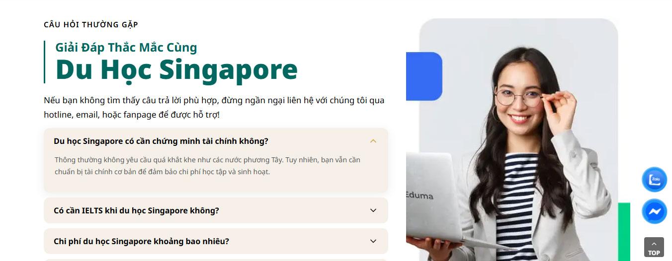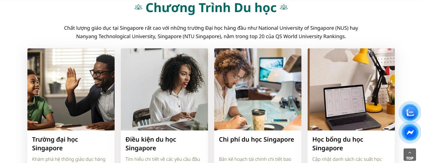 Website được thiết kế theo phong cách chuyên nghiệp, hiện đại với tông màu xanh và trắng chủ đạo, chuyên biệt cho lĩnh vực tư vấn du học và định hướng giáo dục tại Singapore. Giao diện mang lại cảm giác năng động, uy tín và đầy cảm hứng, giúp các bậc phụ huynh và học sinh dễ dàng tìm kiếm thông tin về các chương trình học thuật, từ đó mở ra lộ trình kiến tạo tương lai tại đảo quốc sư tử.