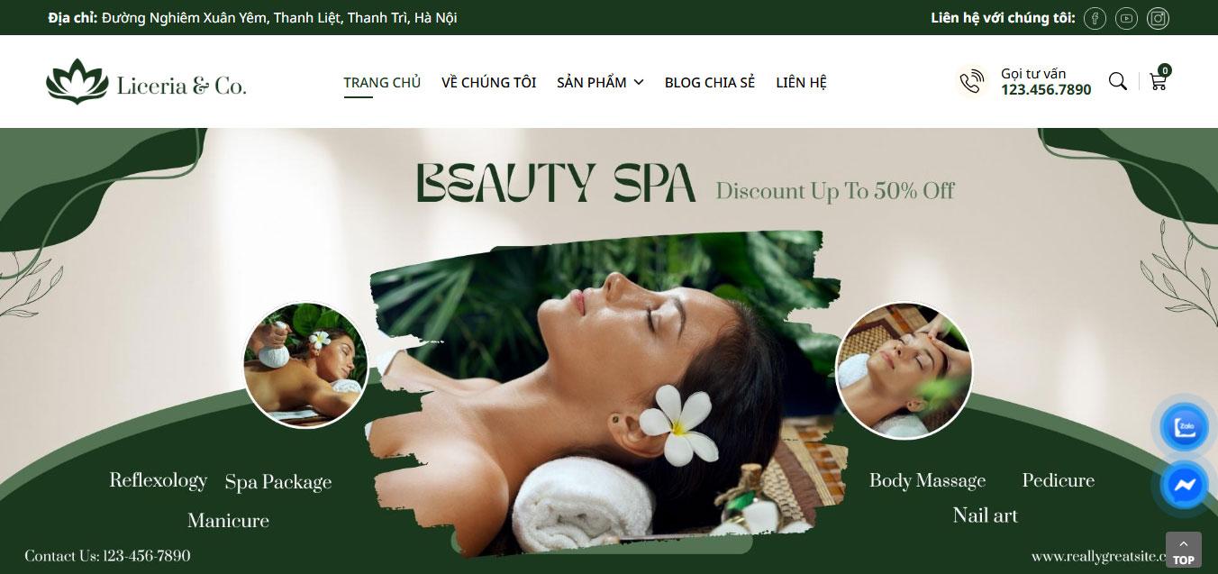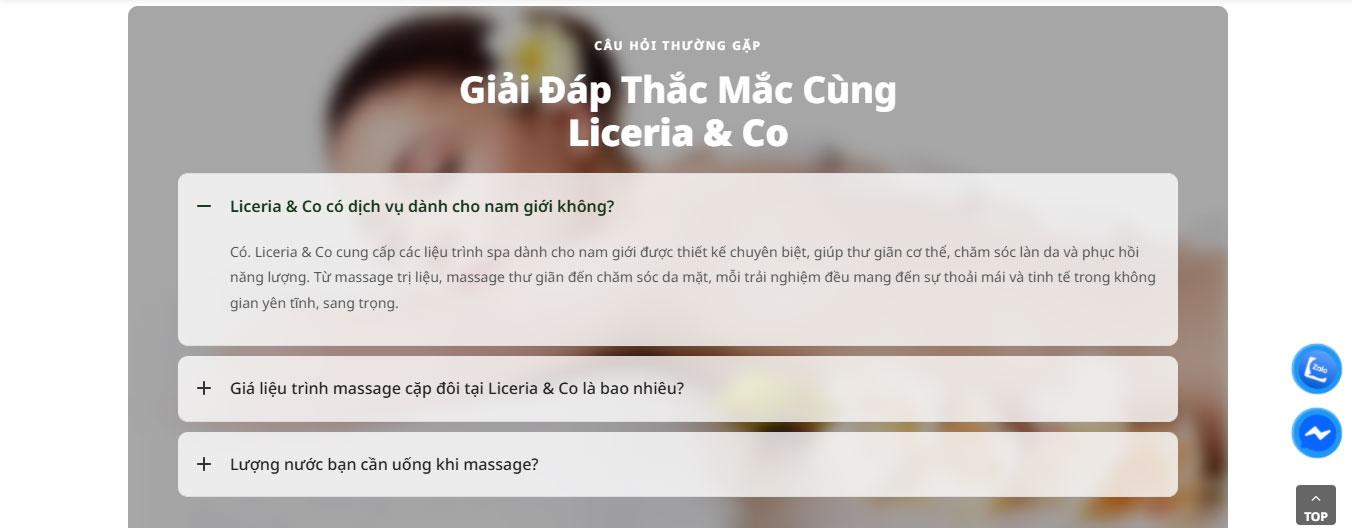 Website tích hợp khu vực Câu hỏi thường gặp (FAQ) tiện lợi bên cạnh hình ảnh chuyên viên tư vấn, giúp giải đáp nhanh các thắc mắc về cách sử dụng và lựa chọn sản phẩm phù hợp. Phần Blog "Bí quyết làm đẹp Liceria" được thiết kế dạng thẻ (card) hiện đại, hỗ trợ người dùng cập nhật những xu hướng chăm sóc da mới nhất và các quy trình dưỡng da chuẩn chuyên gia.