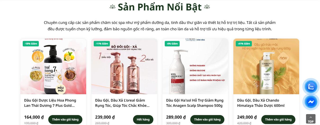 Phần sản phẩm nổi bật được trình bày dạng lưới (grid) 4 cột rõ ràng, hiển thị hình ảnh sản phẩm sắc nét, tên gọi, giá bán và nút "Thêm vào giỏ hàng" màu be đồng bộ. Các sản phẩm được bố trí khoa học với khoảng trống hợp lý, mang lại trải nghiệm xem mượt mà và giúp khách hàng tập trung tối đa vào chi tiết sản phẩm.
