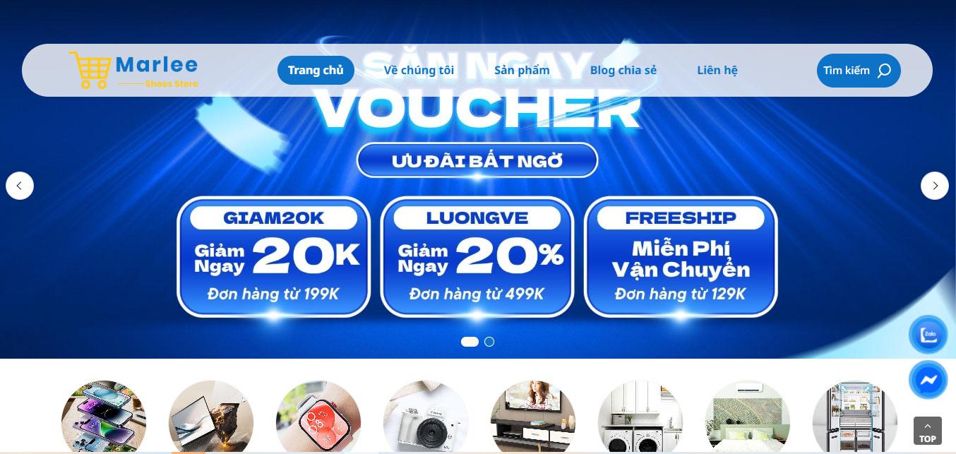 Giao diện website sử dụng tông màu xanh – trắng chủ đạo, kết hợp các điểm nhấn màu vàng tạo cảm giác trẻ trung, nổi bật và đáng tin cậy. Banner đầu trang được thiết kế lớn với các chương trình khuyến mãi hấp dẫn như voucher, freeship, giảm giá, giúp thu hút sự chú ý và kích thích hành vi mua sắm ngay từ đầu.