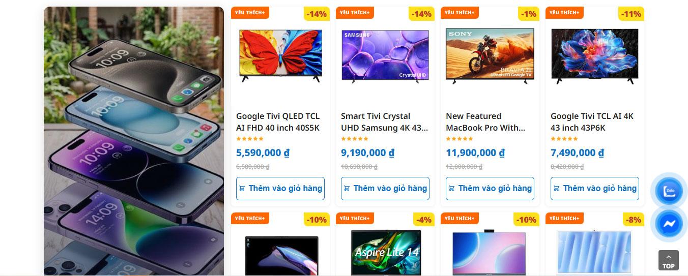 Giao diện website được thiết kế hiện đại, năng động, phù hợp với lĩnh vực thương mại điện tử và bán lẻ sản phẩm công nghệ. Giao diện tập trung vào trải nghiệm người dùng, giúp khách hàng dễ dàng khám phá sản phẩm, tiếp cận ưu đãi và thực hiện mua sắm nhanh chóng, tiện lợi.