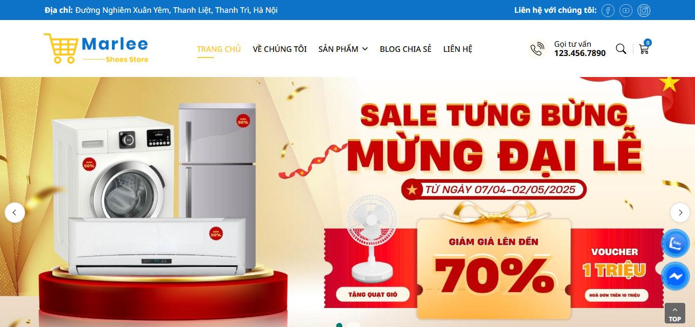 Giao diện website sử dụng tông màu xanh – trắng chủ đạo, kết hợp các điểm nhấn màu vàng tạo cảm giác trẻ trung, nổi bật và đáng tin cậy. Banner đầu trang được thiết kế lớn với các chương trình khuyến mãi hấp dẫn như voucher, freeship, giảm giá, giúp thu hút sự chú ý và kích thích hành vi mua sắm ngay từ đầu.