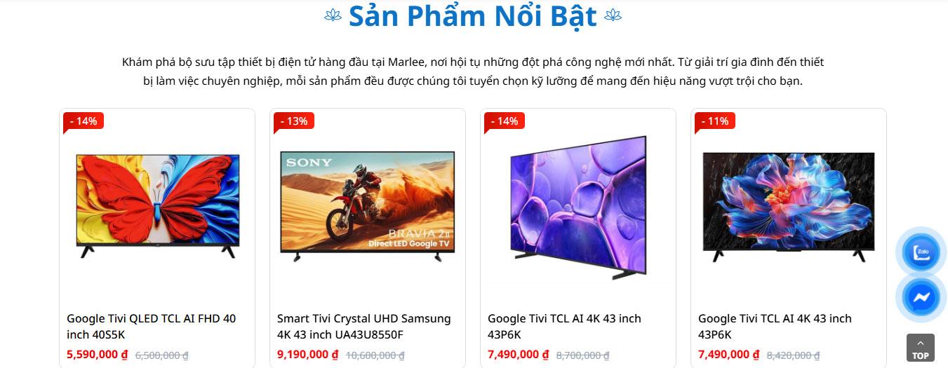 Phần sản phẩm nổi bật được trình bày dạng grid hiện đại, hiển thị rõ hình ảnh, tên sản phẩm, giá bán và mức giảm giá, kèm theo nhãn ưu đãi nổi bật giúp người dùng dễ dàng so sánh và lựa chọn. Khoảng cách giữa các sản phẩm hợp lý, tạo cảm giác thoáng và dễ nhìn.