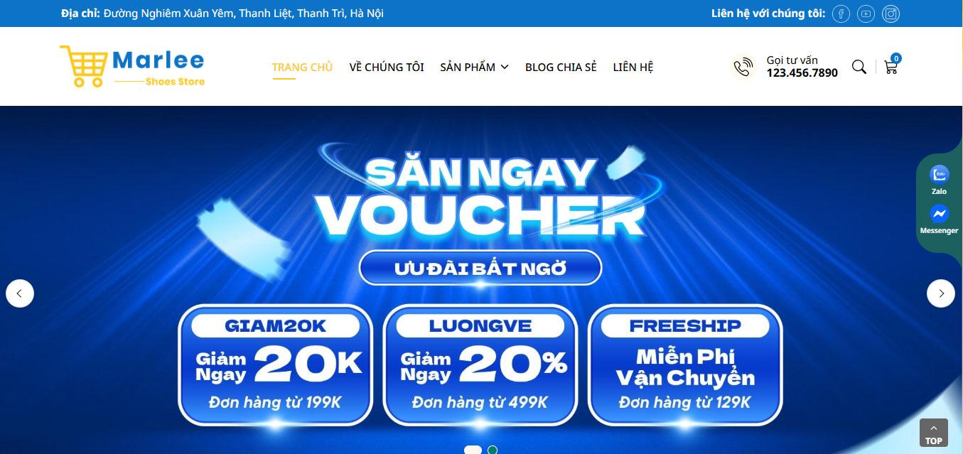 Giao diện website sử dụng tông màu xanh – trắng chủ đạo, kết hợp các điểm nhấn màu vàng tạo cảm giác trẻ trung, nổi bật và đáng tin cậy. Banner đầu trang được thiết kế lớn với các chương trình khuyến mãi hấp dẫn như voucher, freeship, giảm giá, giúp thu hút sự chú ý và kích thích hành vi mua sắm ngay từ đầu.