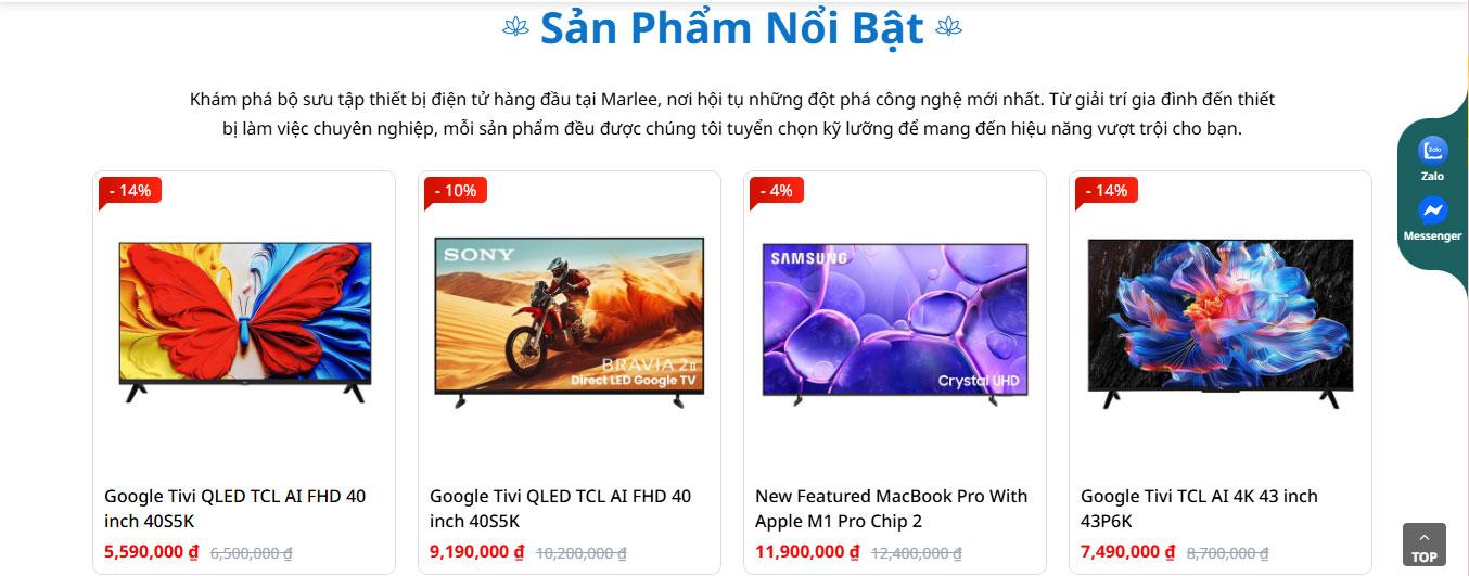 Phần sản phẩm nổi bật được trình bày dạng grid hiện đại, hiển thị rõ hình ảnh, tên sản phẩm, giá bán và mức giảm giá, kèm theo nhãn ưu đãi nổi bật giúp người dùng dễ dàng so sánh và lựa chọn. Khoảng cách giữa các sản phẩm hợp lý, tạo cảm giác thoáng và dễ nhìn.