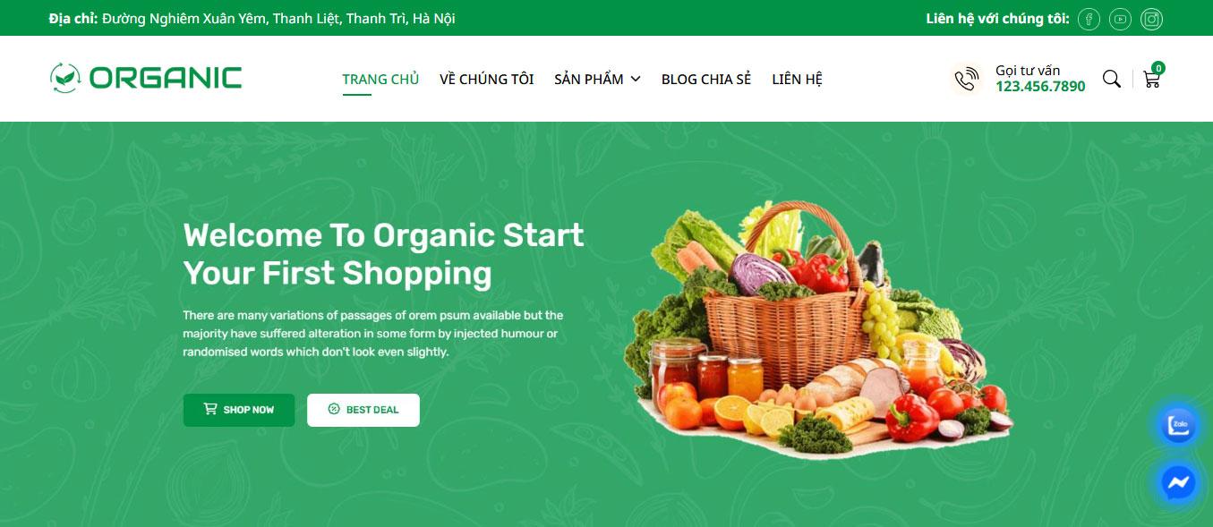 Giao diện website sử dụng tông màu xanh lá cây kết hợp với nền trắng và các sắc thái vàng nhẹ, tạo nên một không gian trực quan sạch sẽ và thân thiện. Banner đầu trang nổi bật với hình ảnh giỏ rau củ tươi ngon cùng thông điệp "Welcome To Organic", thu hút sự chú ý và khẳng định giá trị sản phẩm ngay từ cái nhìn đầu tiên.