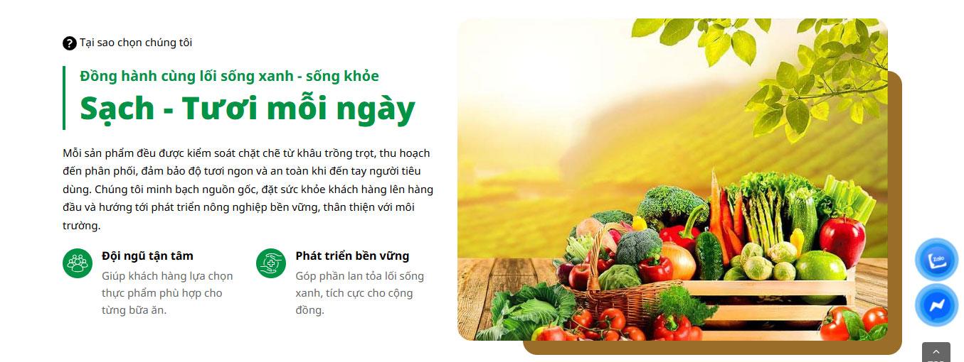 Khu vực giá trị cốt lõi "Sạch - Tươi mỗi ngày" được trình bày với hình ảnh cánh đồng nông trại xanh mướt, kết hợp cùng các dòng liệt kê ưu điểm về quy trình kiểm duyệt và nguồn gốc xuất xứ. Ngay sau đó là phần đánh giá từ khách hàng trên nền xanh đậm tạo điểm nhấn mạnh mẽ, giúp người mua có cái nhìn khách quan về chất lượng dịch vụ.