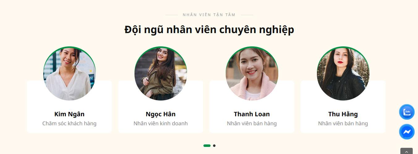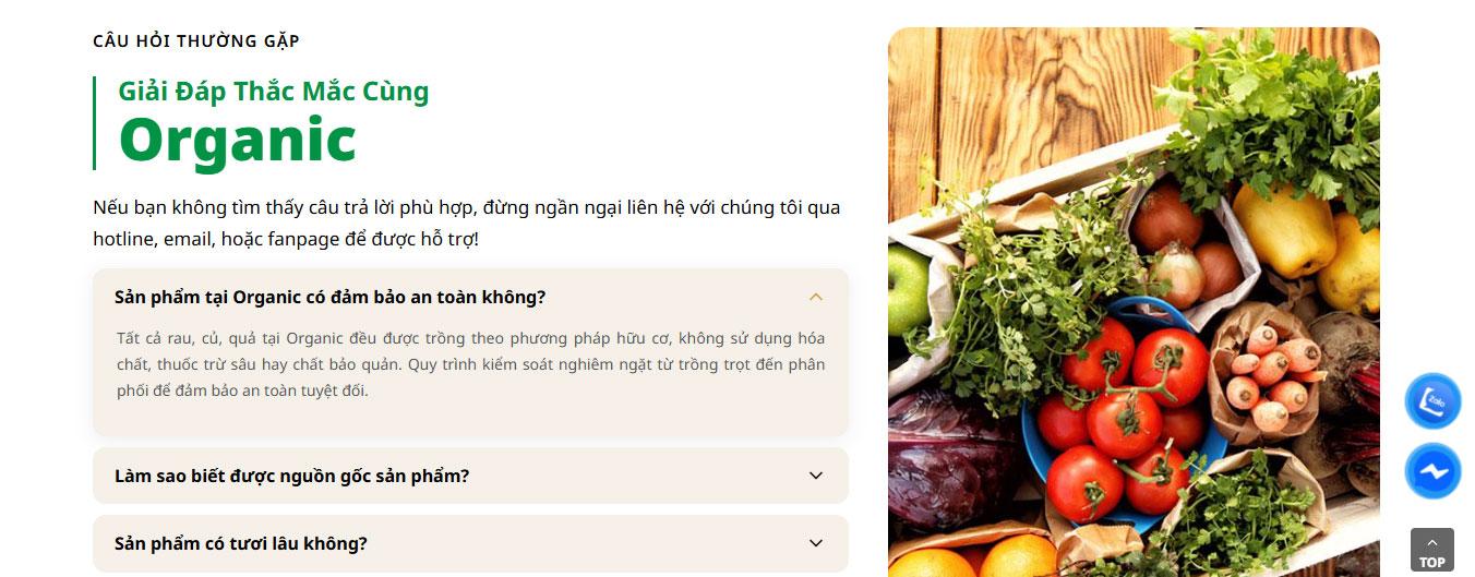 Website tích hợp khu vực Câu hỏi thường gặp (FAQ) bên cạnh hình ảnh rau củ bắt mắt, giúp giải đáp nhanh các thắc mắc về sản phẩm hữu cơ. Khối đội ngũ nhân viên và phần "Cẩm nang sức khỏe Organic" (Blog) được thiết kế dạng card hiện đại, không chỉ tạo sự chuyên nghiệp mà còn cung cấp nhiều kiến thức hữu ích cho người dùng.