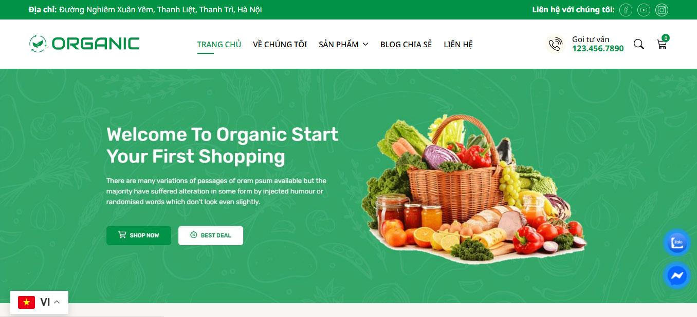 Ngay bên dưới là khu vực banner lớn với thông điệp chào mừng người dùng đến với cửa hàng Organic. Hình ảnh giỏ rau củ tươi được đặt nổi bật bên cạnh nội dung giới thiệu về thực phẩm hữu cơ, nhấn mạnh sự tươi ngon và nguồn gốc tự nhiên của sản phẩm. Phần này còn có các nút kêu gọi hành động như xem sản phẩm hoặc tìm hiểu thêm, giúp tăng khả năng tương tác của khách hàng với trang web.