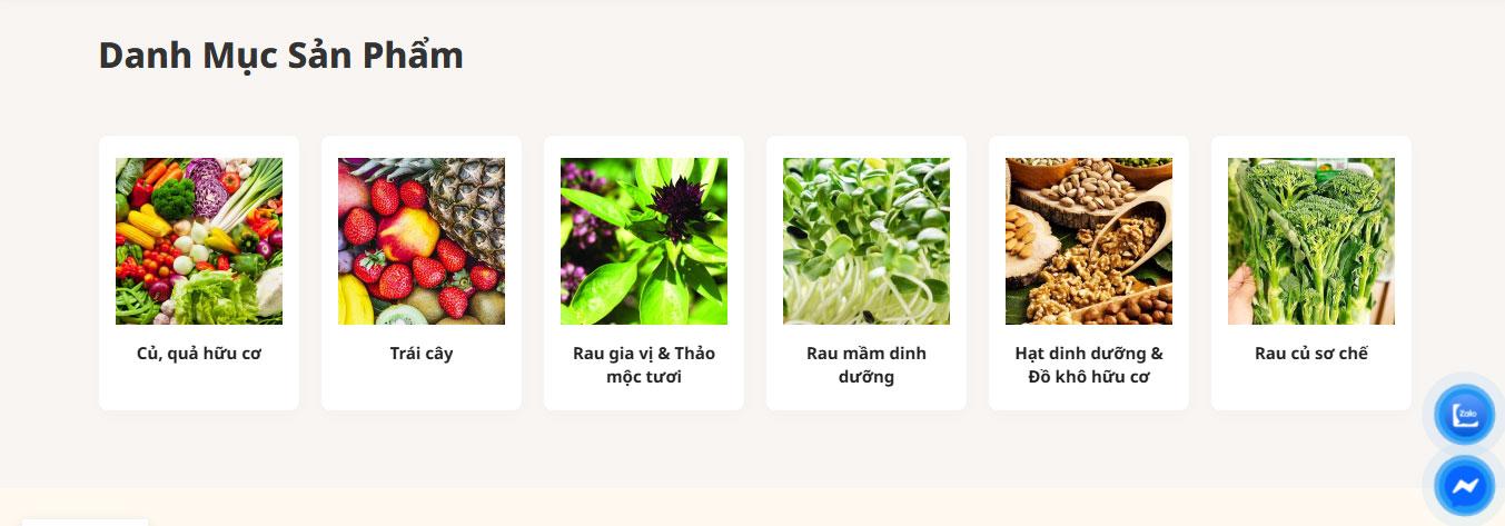 Tiếp theo là khu vực danh mục sản phẩm, nơi các loại thực phẩm được phân chia rõ ràng thành nhiều nhóm như rau gia vị và thảo mộc, rau mầm dinh dưỡng, hạt dinh dưỡng, rau củ quả, combo rau sạch và rau hữu cơ. Mỗi danh mục được hiển thị bằng hình ảnh minh họa và tên gọi cụ thể, giúp người dùng dễ dàng lựa chọn nhóm sản phẩm phù hợp với nhu cầu.