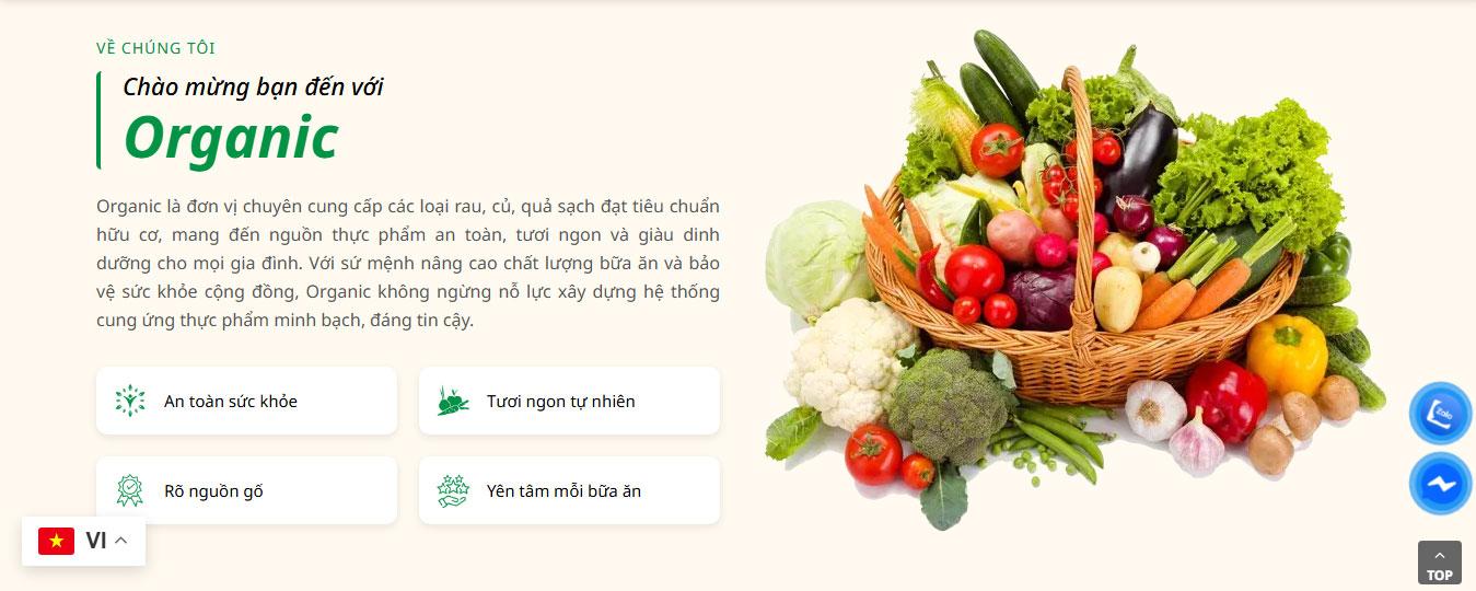 Phần giới thiệu về thương hiệu Organic được thiết kế kết hợp giữa hình ảnh giỏ rau củ và nội dung mô tả. Nội dung nhấn mạnh sứ mệnh cung cấp thực phẩm sạch, tươi ngon và an toàn cho sức khỏe người tiêu dùng. Bên dưới là các biểu tượng thể hiện những lợi ích nổi bật như sản phẩm tươi ngon, rõ nguồn gốc và quy trình kiểm soát chất lượng chặt chẽ.