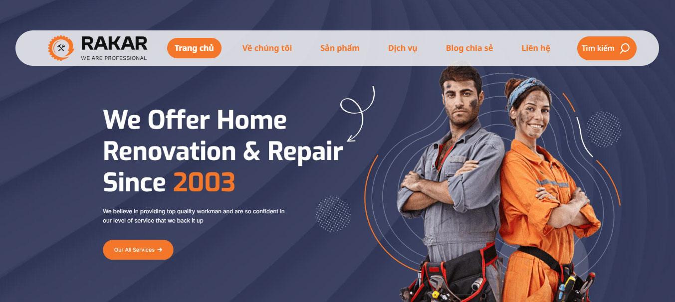 Website tích hợp khu vực Câu hỏi thường gặp (FAQ) tiện lợi bên cạnh hình ảnh kỹ thuật viên lành nghề, giúp giải đáp nhanh các thắc mắc về chính sách bảo hành và hỗ trợ kỹ thuật. Phần Blog "Tin tức công nghiệp Rakar" được thiết kế dạng thẻ (card) hiện đại, hỗ trợ người dùng cập nhật những xu hướng công nghệ chế tạo mới nhất và bí quyết vận hành máy móc hiệu quả.